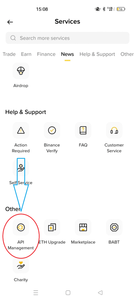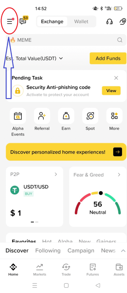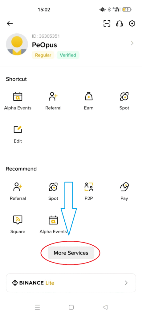 Binance uygulamasını açınız. Sol üstte bulunan ☰ Menü simgesine veya alt bölümdeki More Services seçeneğine dokununuz.