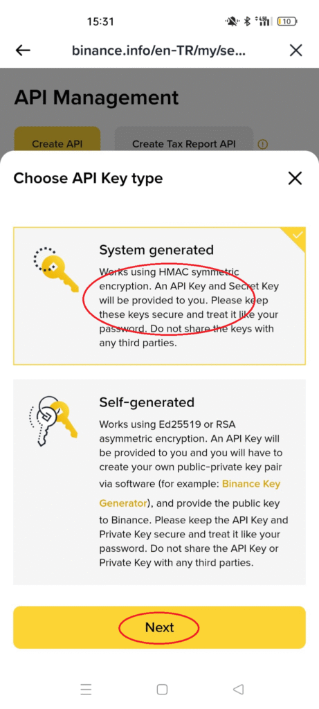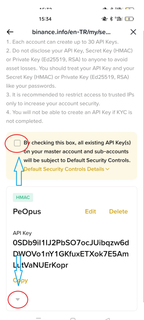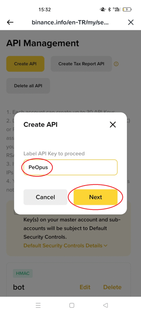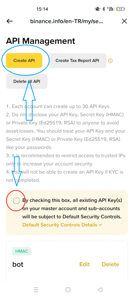 ℹ️ Not: Yanlışlık yapmanız halinde endişelenmeyiniz. Binance üzerinde API oluşturma için herhangi bir limit bulunmamaktadır. Aynı adımları tekrar ederek yeni bir API Key oluşturabilirsiniz.