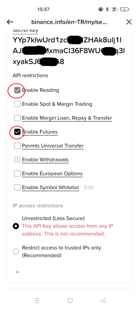 API anahtarınıza verdiğiniz iki izin ( Enable Reading ve Enable Futures )